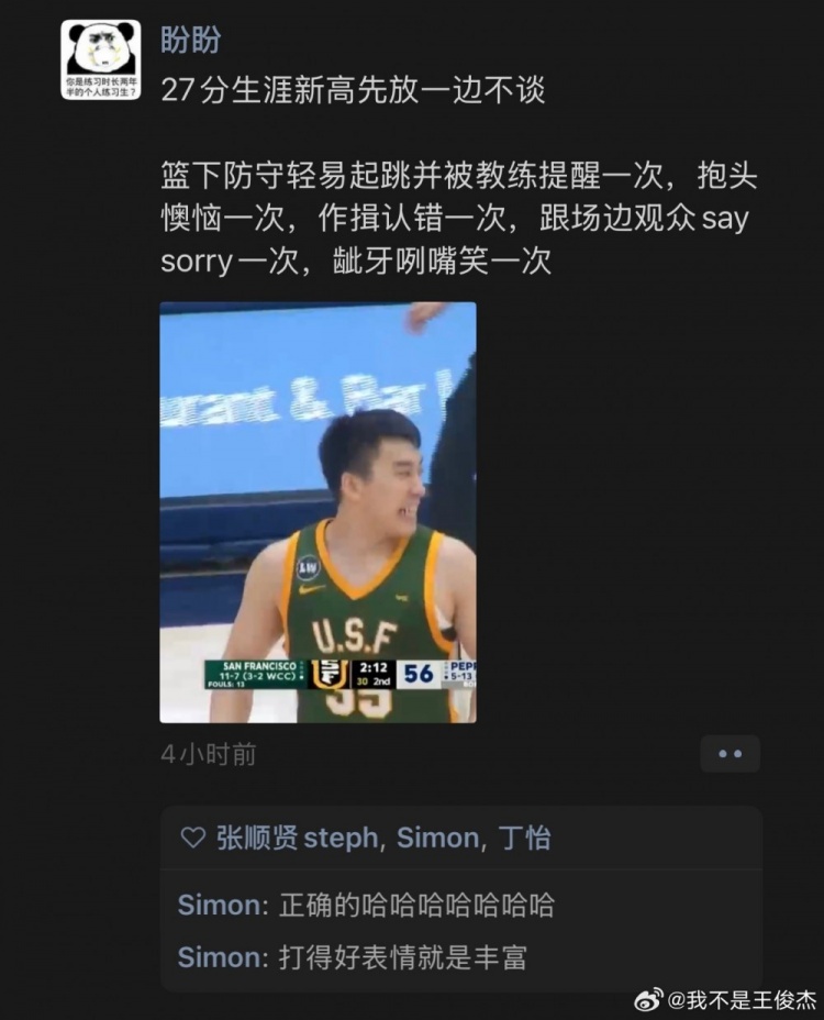 此役,中国球员、旧金山大学前锋王俊杰迎来生涯之夜,重回首发的他攻防建功;全场比赛,王俊杰上阵33分钟14投10中,三分球9中7,砍下27分5篮板1盖帽,得分和三分都创个人生涯新高。